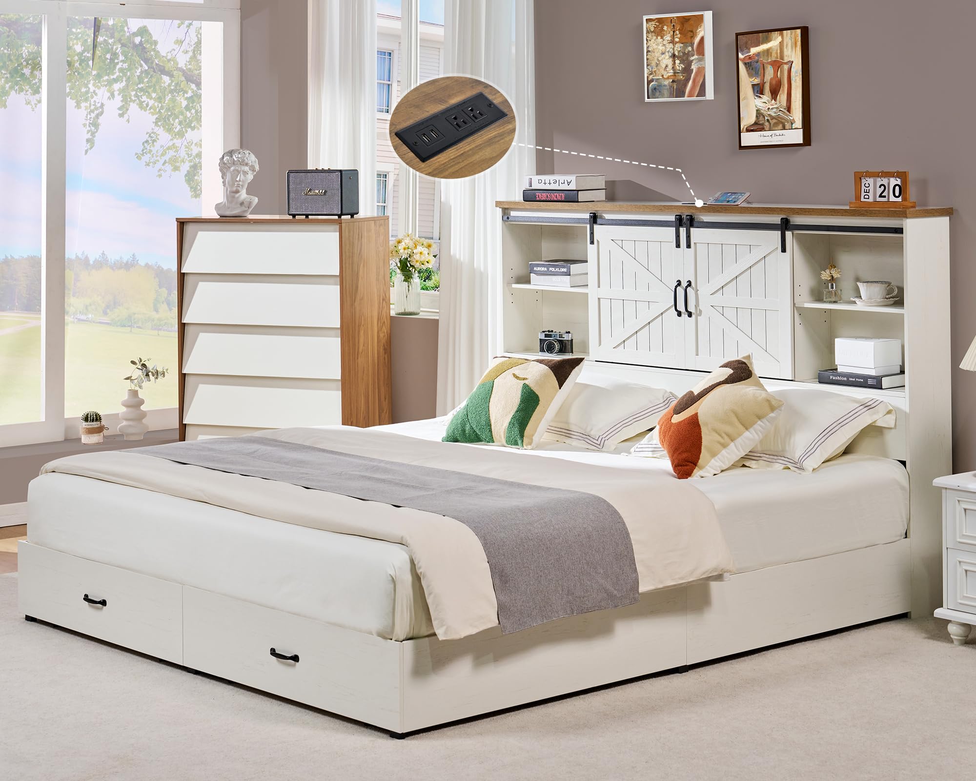 The VanAcc Farmhouse Queen Bed Frame (Model BMB006) is designed to provide a sturdy and functional sleeping solution with integrated storage and convenience features. It features a rustic farmhouse aesthetic with a white wooden finish and a barn door-inspired bookcase headboard.